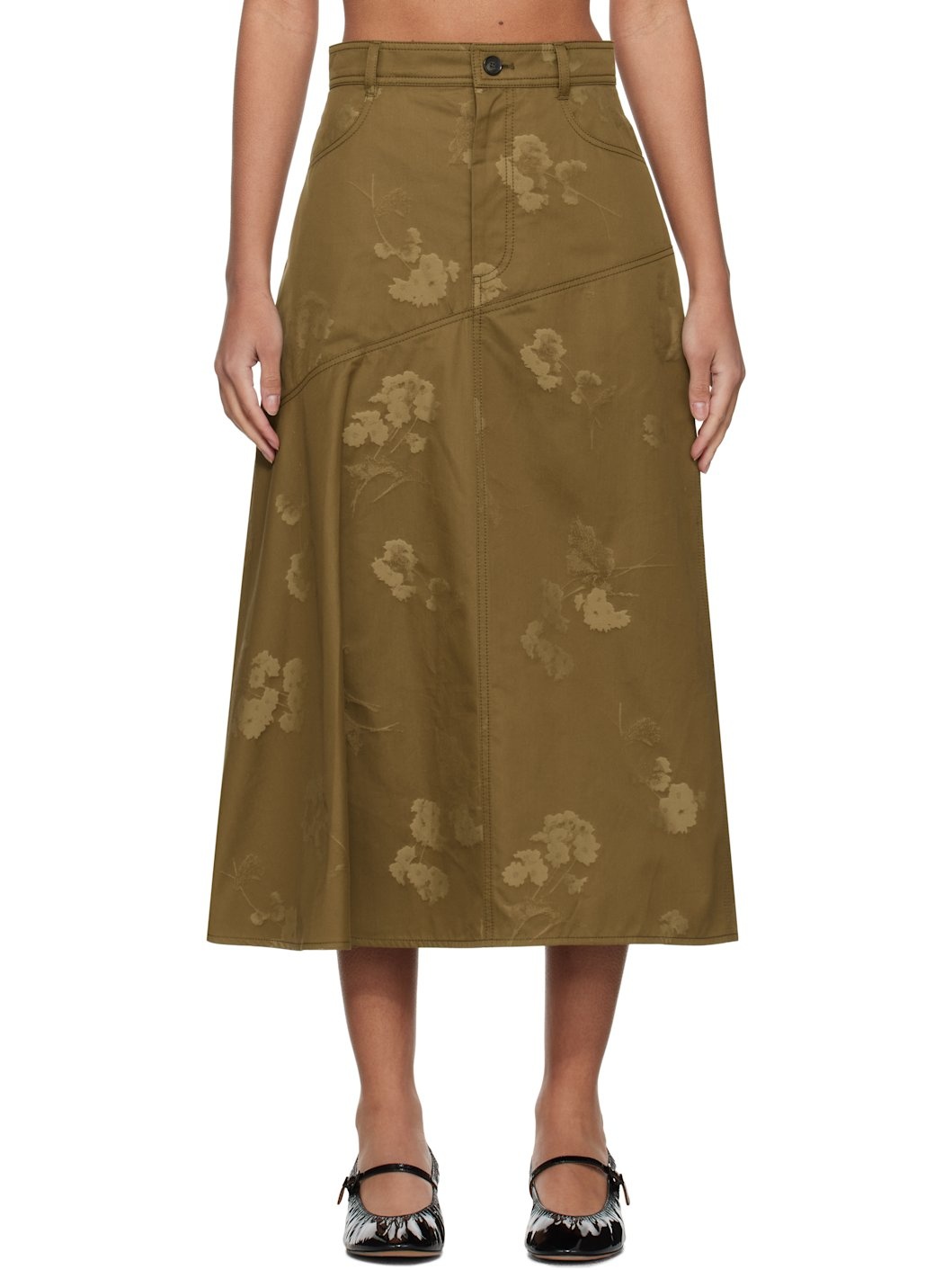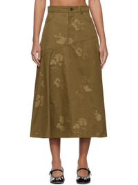 Cotton twill midi skirt. Jacquard floral pattern throughout. · Paneled construction · Belt loops · Two-pocket styling · Zip-fly · Asymmetric hem · Draping at side seam Supplier color: Khaki Body: 100% cotton. Lining: 100% cotton. Made in United Kingdom 251641F092002