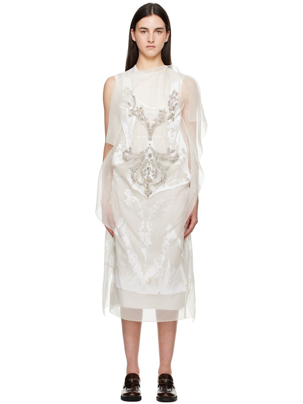 Silk organza midi dress. · Layered and asymmetrical construction · Round neck · Printed pattern and crystal-cut accents at front · Vented side seams · Zip closure at back · Fully lined Supplier color: Elena imprint white Body: 100% silk. Lining: 100% silk. Made in United Kingdom 251641F054007
