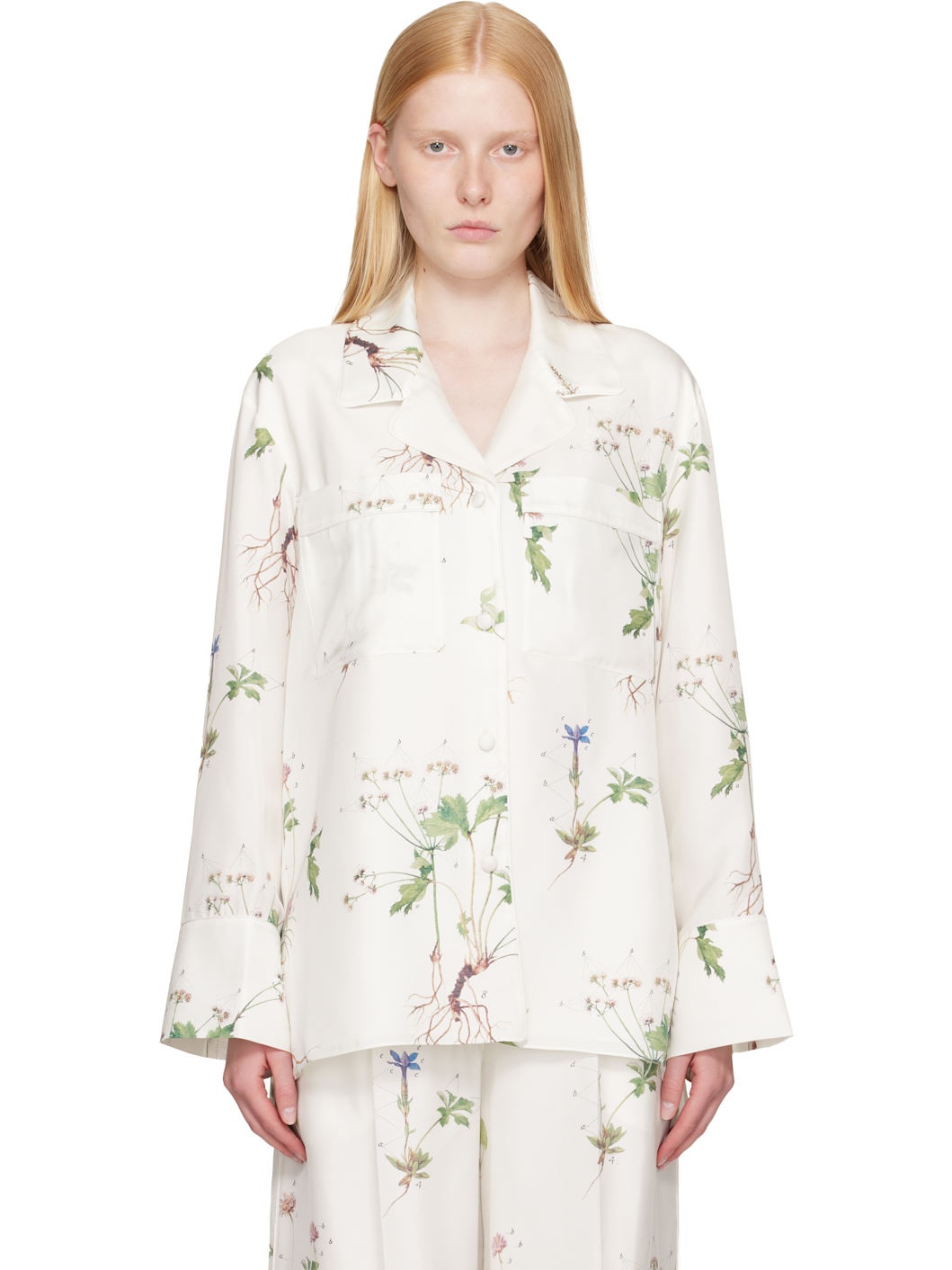 Silk twill shirt. Printed floral pattern and piping throughout. · Notched lapel · Button closure · Patch pockets at chest · Vented droptail hem · Dropped shoulders · Button fastening at vented cuffs Supplier color: Botanical violet white 100% silk. Made in Bulgaria 252641F109000