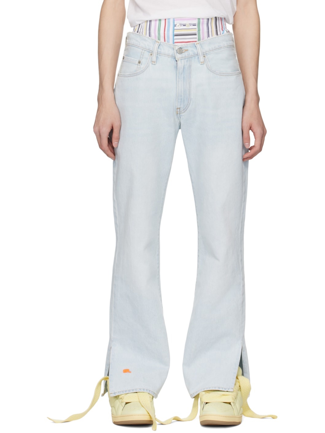 Bootcut non-stretch denim jeans. Distressing and subtle fading throughout. · Low-rise · Belt loops · Five-pocket styling · Zip-fly · Logo embroidered at front leg · Vented cuffs · Logo printed at back waistband · Logo flag at back pocket · Logo-engraved silver-tone hardware · Contrast stitching in beige Part of the ERL x Levi’s collaboration. Supplier color: Blue