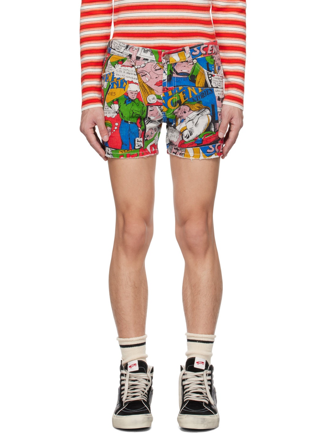 Non-stretch denim shorts. Graphics and text printed throughout. · Pre-washed · Belt loops · Four-pocket styling · Zip-fly · Raw edge at cuffs · Logo-engraved antiqued silver-tone hardware Supplier color: Comic book 100% cotton. Made in Italy 231260M193035
