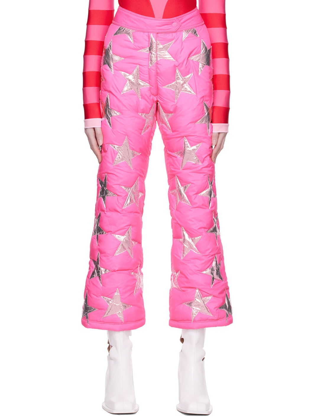 Padded polyester taffeta trousers. Graphic appliques throughout. · Zip-fly · Inset elasticized cuffs · Full cotton canvas lining Supplier color: Pink Body: 100% polyester. Trim: 87% polypropylene, 13% polyurethane. Fill: 100% polyester. Lining: 100% cotton. Made in Turkey 222260F087000
