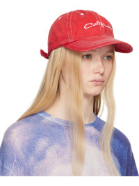 Cotton twill cap in red. Fading throughout. · Embroidered eyelets at crown · Text embroidered at face · Curved brim · Cinch fastening · Twill browband · Logo-engraved antiqued silver-tone hardware · Contrast stitching in white Supplier color: Red 100% cotton. Made in United States 252260F016002