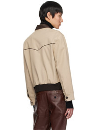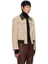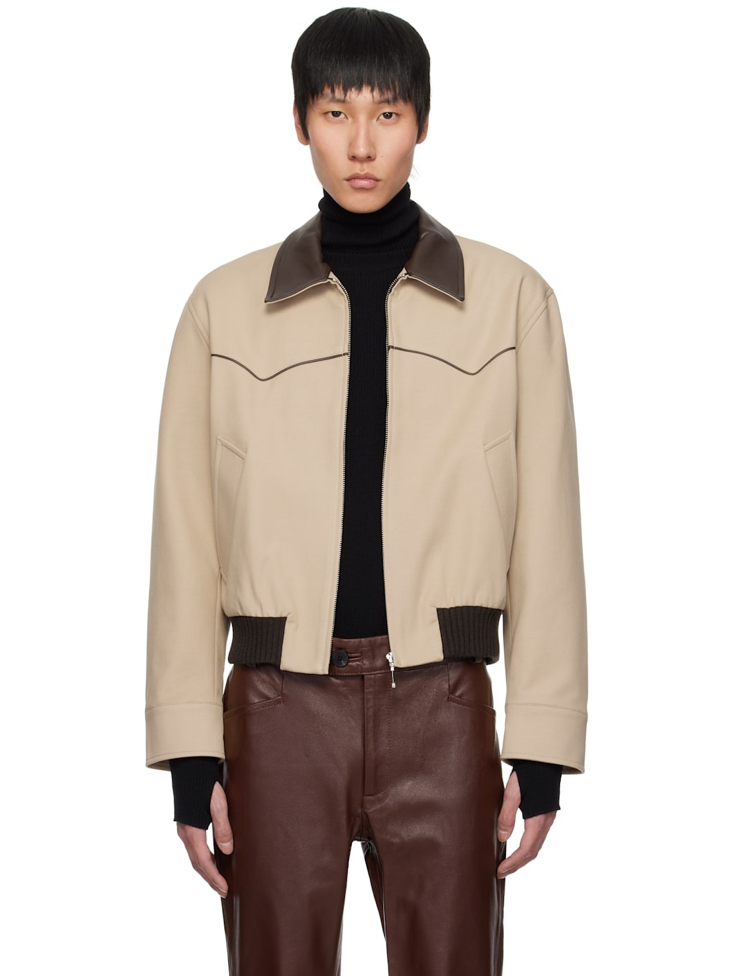 Plain-woven stretch cotton jacket. Grained lambskin trim throughout. · Paneled construction · Spread collar · Zip closure · Piping at western yoke · Welt pockets · Rib-knit hem · Single-button barrel cuffs · Welt pocket at interior · Full satin lining Supplier color: Beige Body 1: 94% cotton, 6% elastane. Body 2: 100% lambskin. Lining: 52% viscose, 48% cupro. Made in Portugal 251600M180008