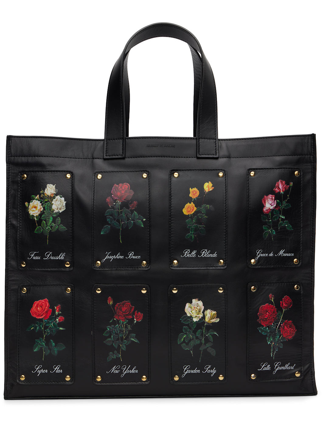 Buffed lambskin tote. · Studded floral-printed appliques throughout · Fixed carry handles · Logo embossed at face · Patch pocket at interior · Twill lining · H14" x W17" x D4" Supplier color: Rose patch print Lambskin. Made in Portugal 252600M172003