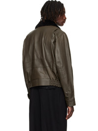 Grained lambskin jacket. · Pin-buckle straps at shearling spread collar · Concealed zip closure · Flap and welt pockets at waist · Elasticized hem · Grommets at armscyes · Press-stud barrel cuffs · Welt pocket at interior · Full satin lining · Silver-tone hardware Supplier color: Olive Body: 100% lambskin. Lining: 52% viscose, 48% cupro. Made in Portugal 252600M181003