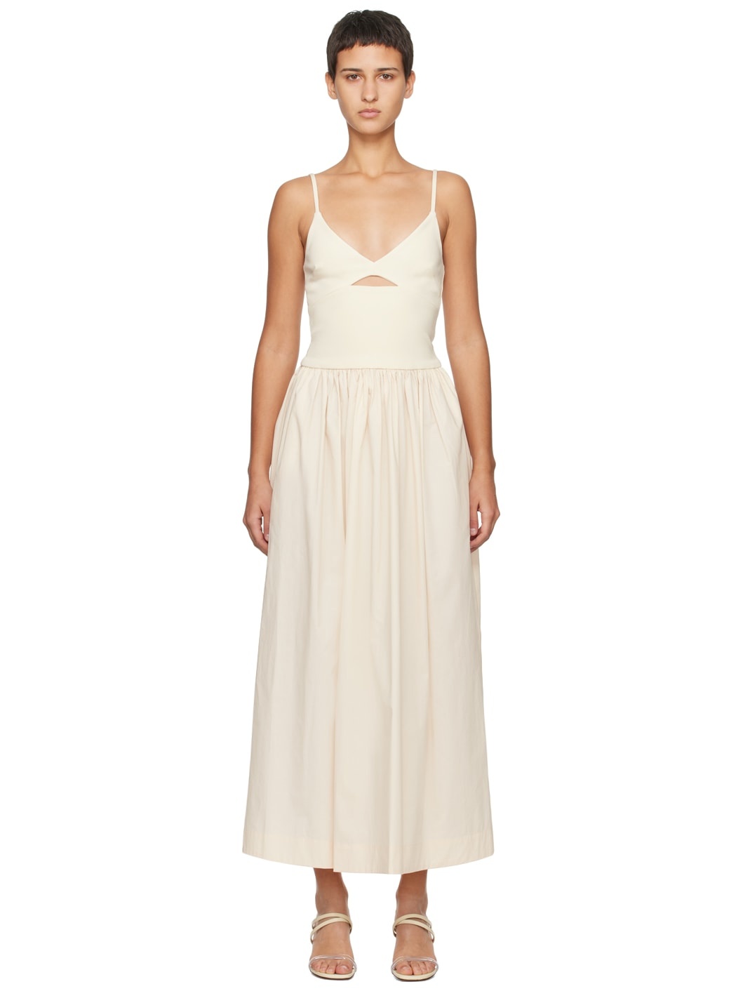 Cotton poplin and FSC-certified stretch viscose-blend jersey dress. · Paneled construction · V-neck · Darts at cups · Cutout at chest · Gathering at waist · Fixed shoulder straps · Zip closure at back · Partial jersey lining Supplier color: Crema Body 1: 100% cotton. Body 2: 68% viscose, 26% nylon, 6% elastane. Made in Australia 241475F055004