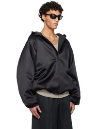 Insulated stretch satin bomber jacket. · Fading throughout · Rubber logo patch at hood · Two-way zip closure · Bungee-style drawstring at hem · Raglan sleeves · Inset rib-knit cuffs · Text appliques at back · Plain-woven lining Part of the Fear of God ESSENTIALS Holiday collection. Supplier color: Vintage black Body: 97% polyester, 3% spandex. Body 2: 95% polyester, 5% spandex. Fill: 100% polyester. Trim: 53% cotton, 42% polyester, 5% spandex. Lining: 100% polyester. Made in Viet Nam 261161M175000