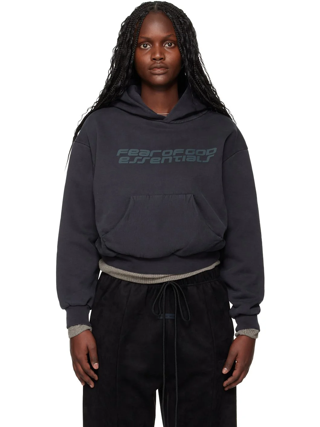 Cotton fleece hoodie. · Rubber logo patch at hood · Logo bonded at chest · Kangaroo pocket · Rib-knit hem and cuffs · Cropped hem · Dropped shoulders · Text bonded at back Part of the Fear of God ESSENTIALS Holiday collection. Supplier color: Vintage black 100% cotton. Made in Viet Nam 261161F097016