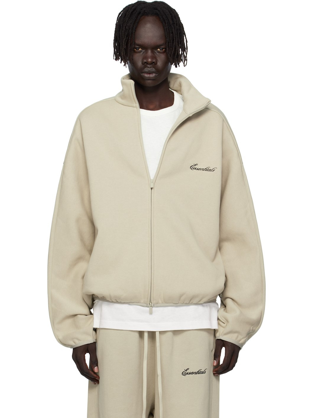 Cotton-blend fleece track jacket. · Stand collar · Two-way zip closure · Logo embroidered at chest · Seam pockets at waist · Elasticized hem and cuffs · Piping at sleeves · Rubber logo patch at back collar Supplier color: Abbey stone/Tonal piping 80% cotton, 20% polyester. Made in Viet Nam 252161M202002