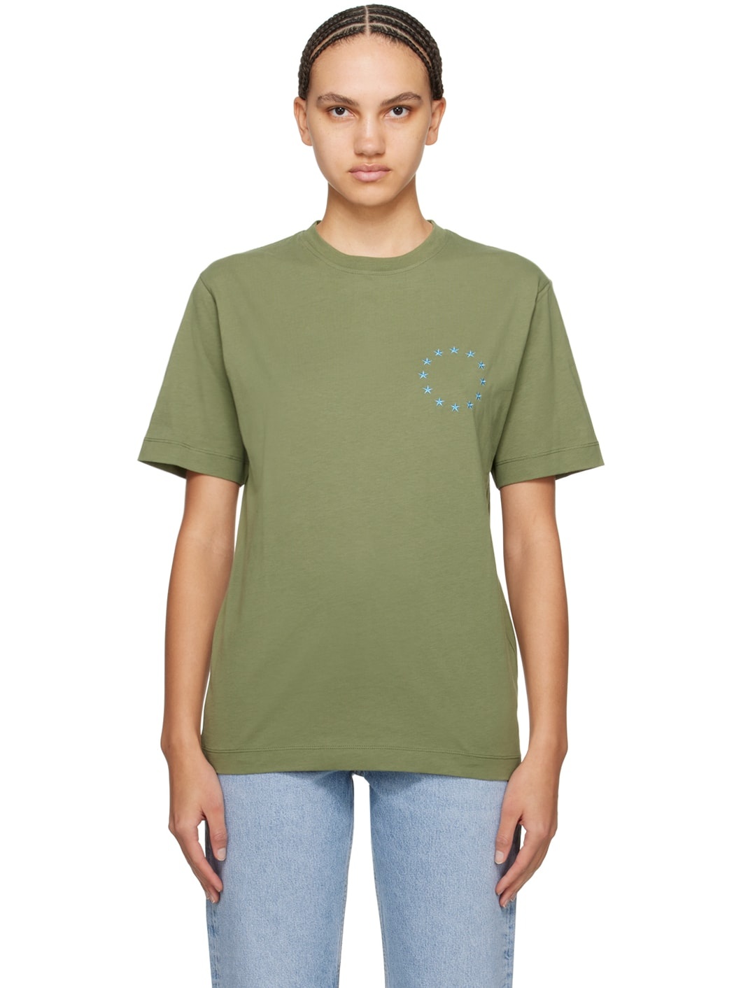 Organic cotton jersey T-shirt. · Rib knit crewneck · Logo graphic embroidered at chest and back Supplier color: Olive 100% organic cotton. Made in Portugal 241647F110008