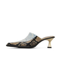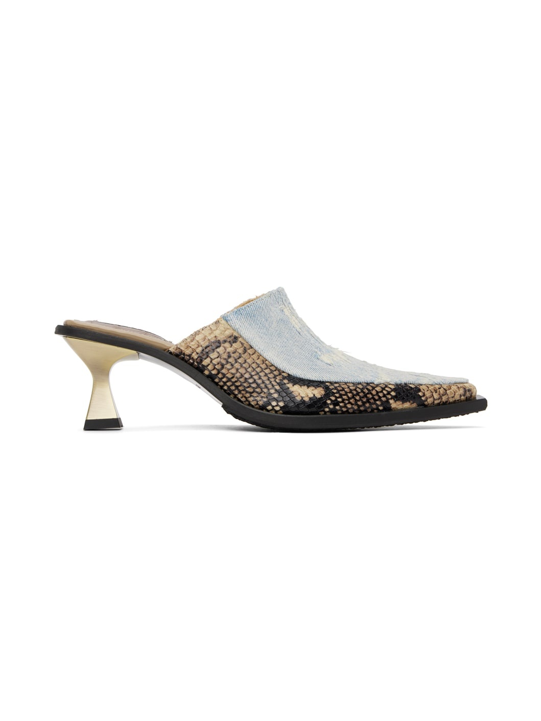 Paneled denim and croc-embossed leather slip-on heels in blue and brown. · Pointed toe · Distressing at vamp · Logo patch at padded leather footbed · Grained calfskin lining · Metal kitten heel with rubber injection · Tunit sole with rubber injection · Heel: H2" Supplier color: Denim slashed Upper: leather, textile. Sole: rubber. Made in Portugal 241640F121003