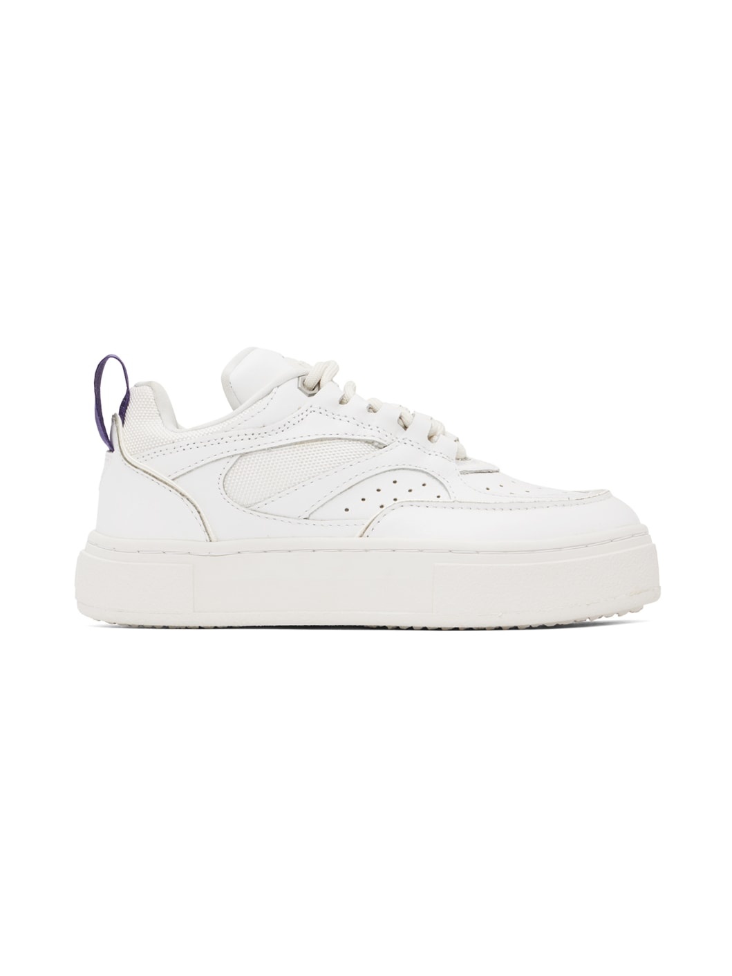 Low-top paneled buffed leather and canvas sneakers in white. Perforated detailing at toe and vamp. · Lace-up closure · Logo embossed at padded tongue · Padded collar · Grosgrain pull-loop at heel counter · Jersey lining · Textured rubber midsole · Treaded rubber outsole Supplier color: White Upper: leather, textile. Sole: rubber. Made in Viet Nam 231640F128006