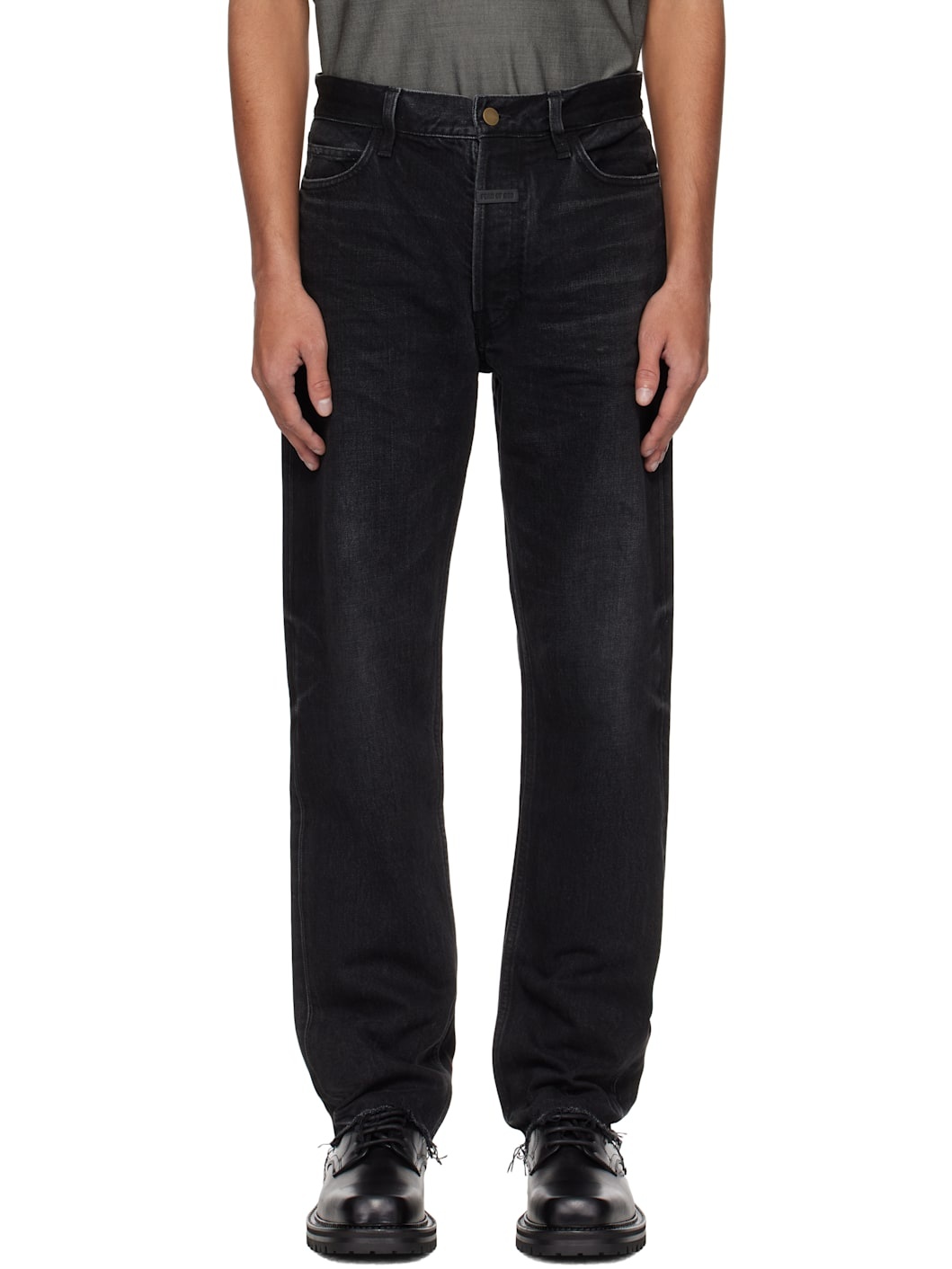 Straight-leg non-stretch denim jeans. Fading and whiskering throughout. · Belt loops · Five-pocket styling · Button fly · Rubberized logo patch at front · Frayed edge at cuffs · Logo-engraved bronze-tone hardware · Contrast stitching in tan Supplier color: Black 100% cotton. Made in Japan 251782M186006