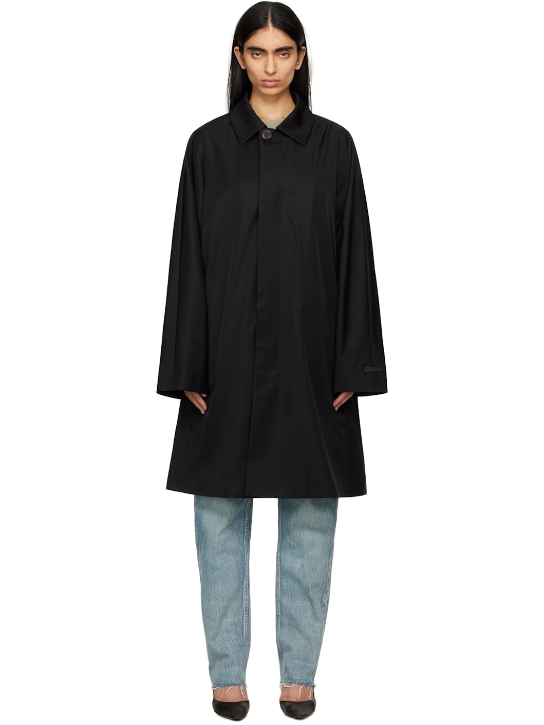 Loose-fit nylon- and wool-blend twill coat. · Spread collar · Concealed button closure · Seam pockets · Rubberized logo patch at cuff · Locker loop at back collar · Welt pocket at interior · Partial sateen and twill lining · Logo-engraved horn hardware Part of the Eternal collection. Supplier color: Black Body: 60% polyamide, 40% wool. Lining 1: 100% polyester. Lining 2: 80% polyester, 20% polyurethane. Made in Italy 251782F059000