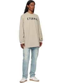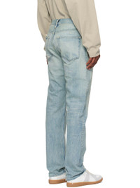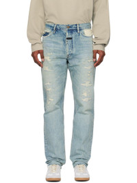 Straight-leg non-stretch denim jeans. Fading, hand-distressing, and topstitching throughout. · Belt loops · Five-pocket styling · Logo patch at button fly · Frayed edge at cuffs · Contrast stitching in tan Supplier color: Repaired medium indigo 100% cotton. Made in Japan 251782M186007