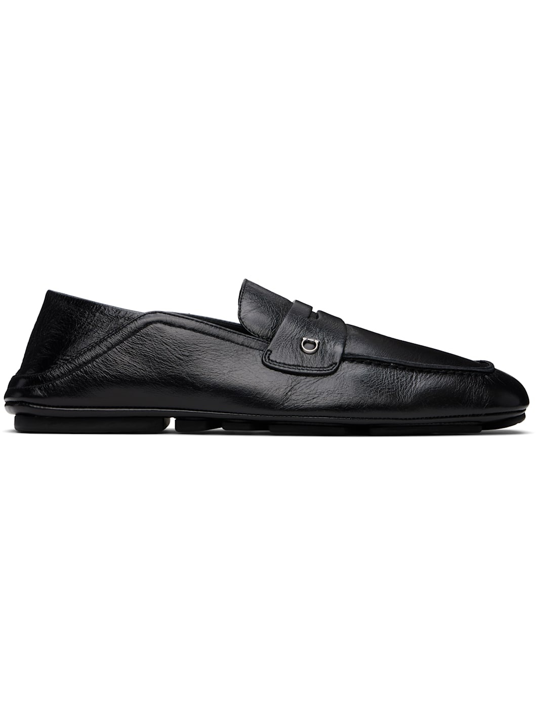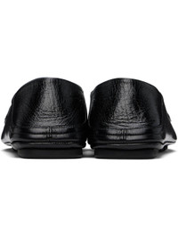 Grained calfskin loafers in black. · Square moc toe · Strap with cutout and logo hardware at vamp · Buffed calfskin lining · Collapsible heel counter · Treaded rubber sole Supplier color: Nero Upper: calfskin. Sole: rubber. Made in Italy 251270M231049