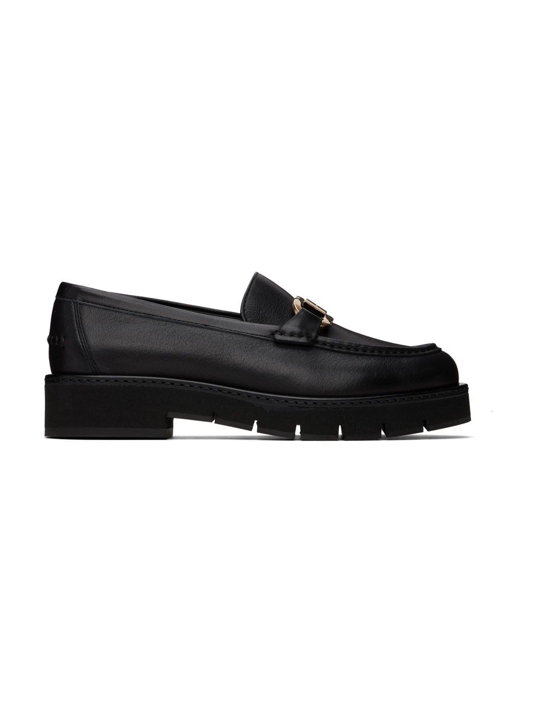Grained calfskin loafers in black. · Moc toe · Logo hardware and strap at vamp · Pinched seam at heel counter · Topstitching at welt · Suede and buffed leather lining · Platform foam rubber midsole · Lugged rubber sole · Logo-engraved gold-tone hardware · Platform: H1.5" Supplier color: Nero