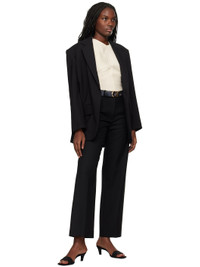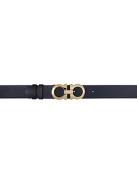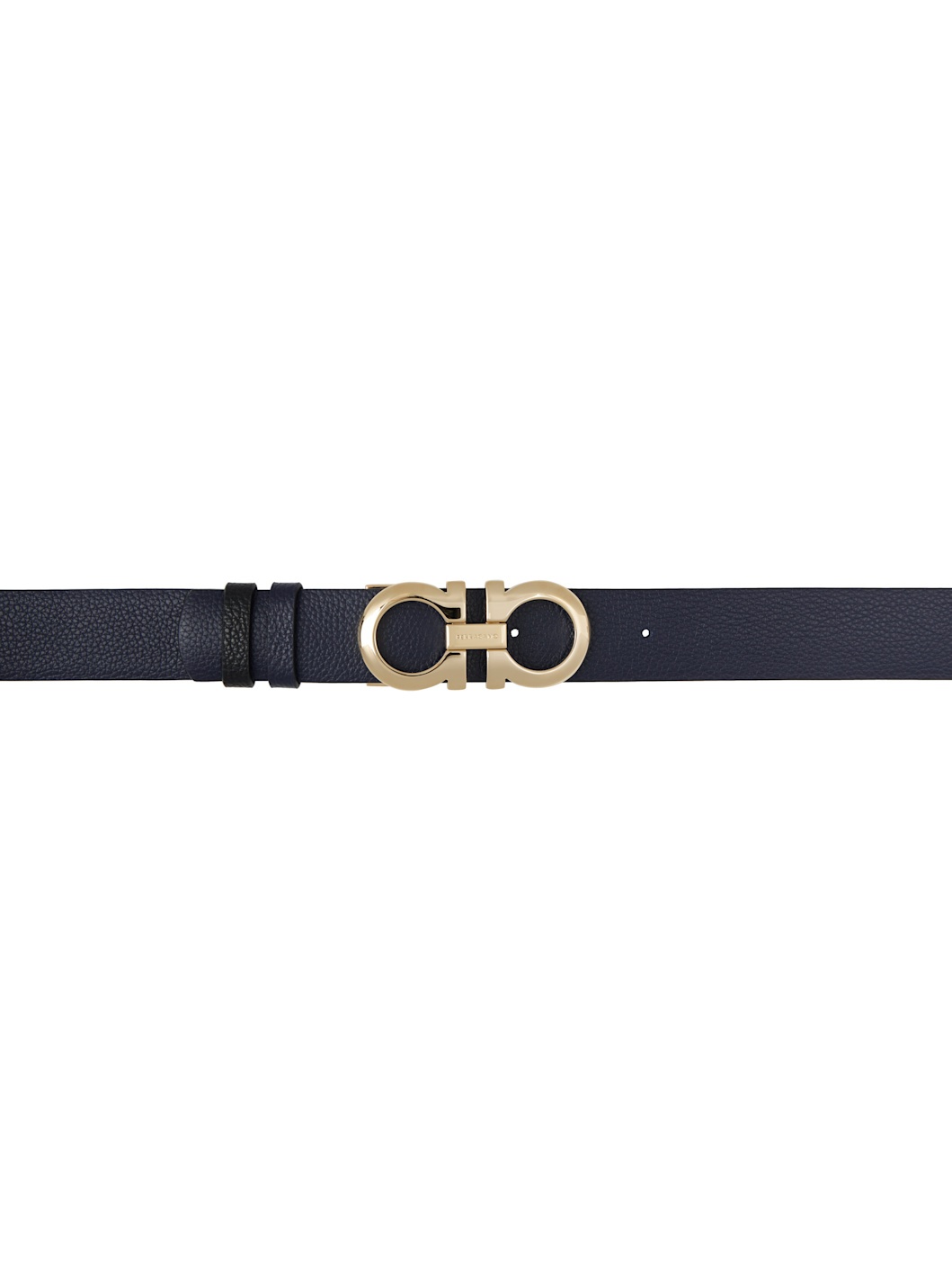 Reversible grained calfskin belt in navy. Reverse in black grained calfskin. · Logo hardware at post-stud fastening · Gold-tone hardware · W1.25" Supplier color: Mirto/Nero