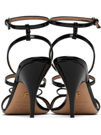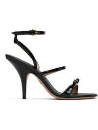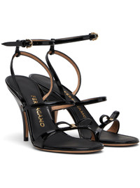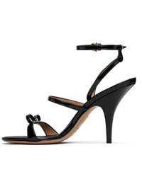Patent leather heeled sandals. · Open toe · Straps and logo-engraved bow accent at vamp · Adjustable pin-buckle ankle strap · Logo stamp at padded footbed · Covered stiletto heel · Leather sole with rubber injections · Logo hardware at sole · Gold-tone hardware · Heel: H3.5" Supplier color: Nero/Vernice nero Upper: leather. Sole: leather, rubber. Made in Italy 251270F125001