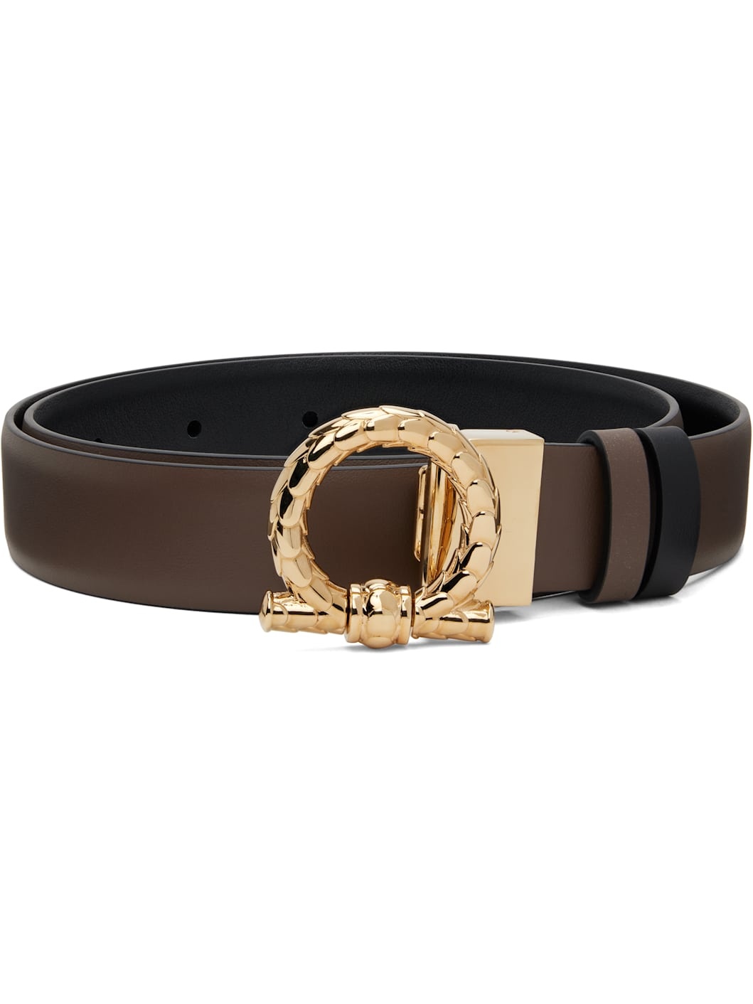 Reversible buffed calfskin belt. Reverse in black buffed calfskin. · Keeper loops at length · Textured logo hardware at post-stud fastening · Gold-tone hardware · W1" Supplier color: Clay/Nero Calfskin. Made in Italy 251270F001005