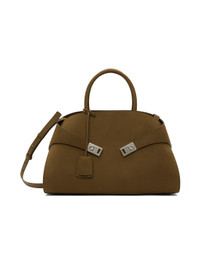 Calfskin suede top handle bag in brown. · Twin rolled carry handles · Detachable sheathed keyring at carry handle · Adjustable and detachable shoulder strap · Logo hardware and logo embossed at face · Adjustable flip-clasp straps at face · Expansion panel at sides · Toggle fastening at open throat · Zip pocket at interior · Buffed leather lining · H10" x W15" x D8" · Total height: H15" Supplier color: Clay chiaro