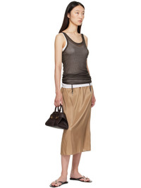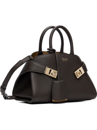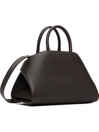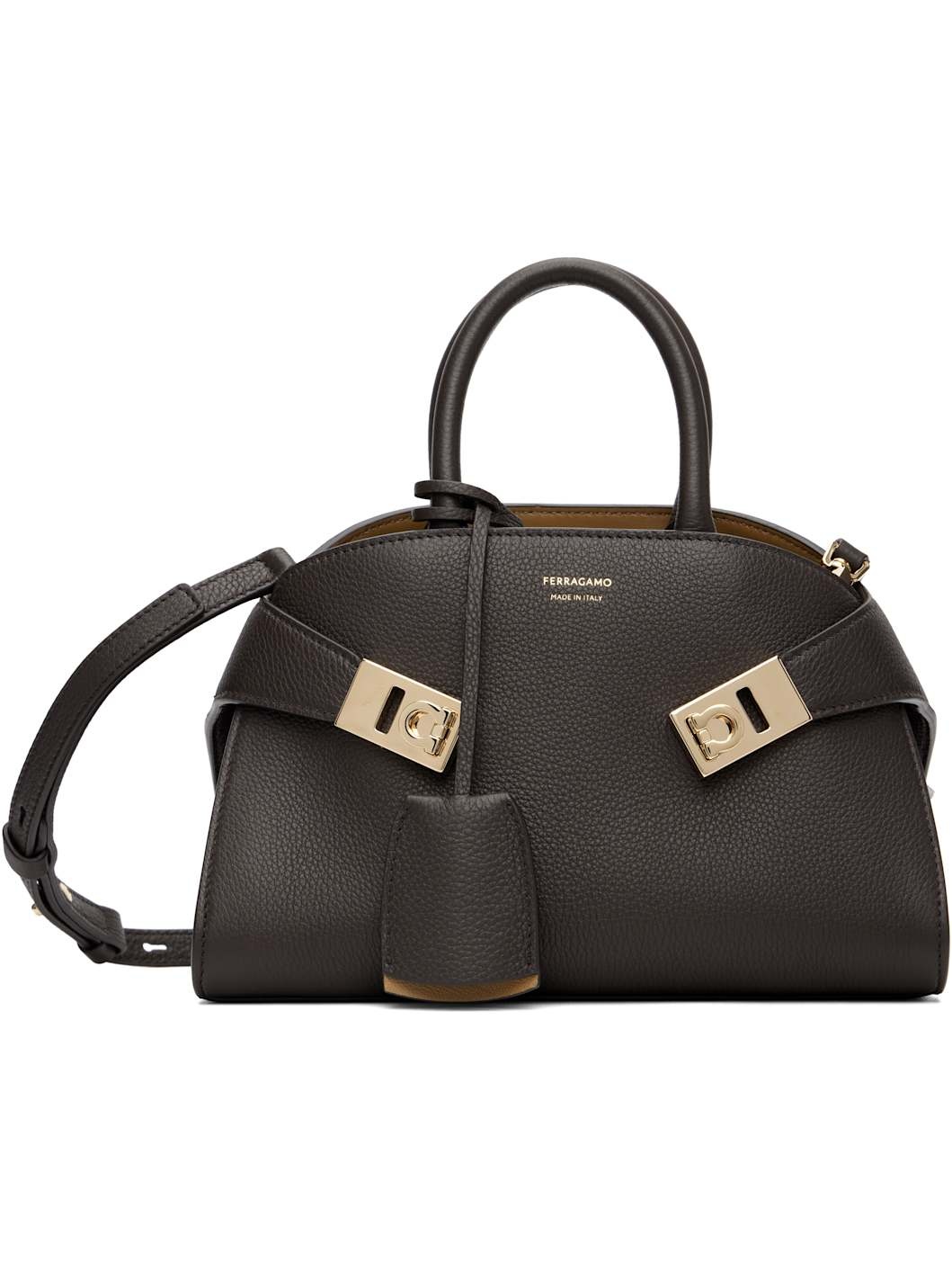 Vegetable-dyed hammered calfskin top handle bag. · Twin rolled carry handles · Adjustable and detachable crossbody strap · Detachable sheathed keyring at handle · Logo stamp at face · Flip-clasp strap at sides · Open throat · Two card slots at interior · Buffed leather lining · H5.5" x W9" x D5" Supplier color: Testa di moro/Burnt ocher Calfskin. Made in Italy 252270F046005