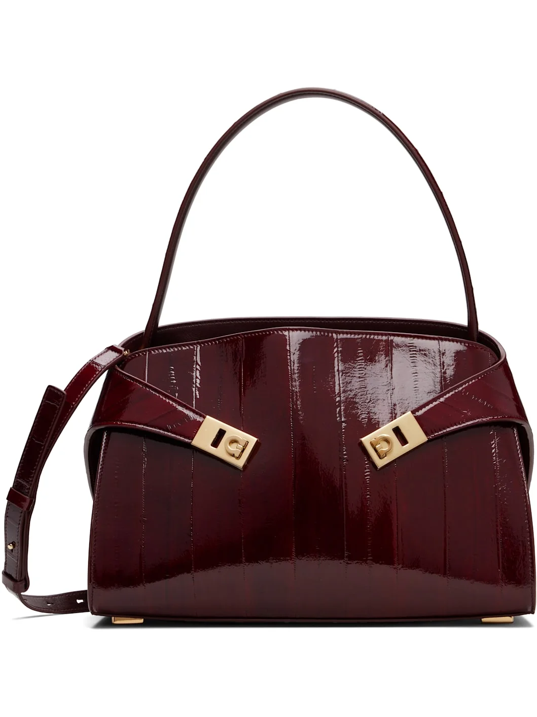 Patent eel leather shoulder bag. · Fixed shoulder strap · Detachable and adjustable crossbody strap · Flip-clasp straps at face · Bumper studs at base · Magnetic closure · Zip pocket and two card slots at interior · Grained calfskin lining · Logo-engraved gold-tone hardware · H8.5” x W12.5” x D5.5” Supplier color: Dark Wine Eel leather, calfskin. Made in Italy 252270F046020