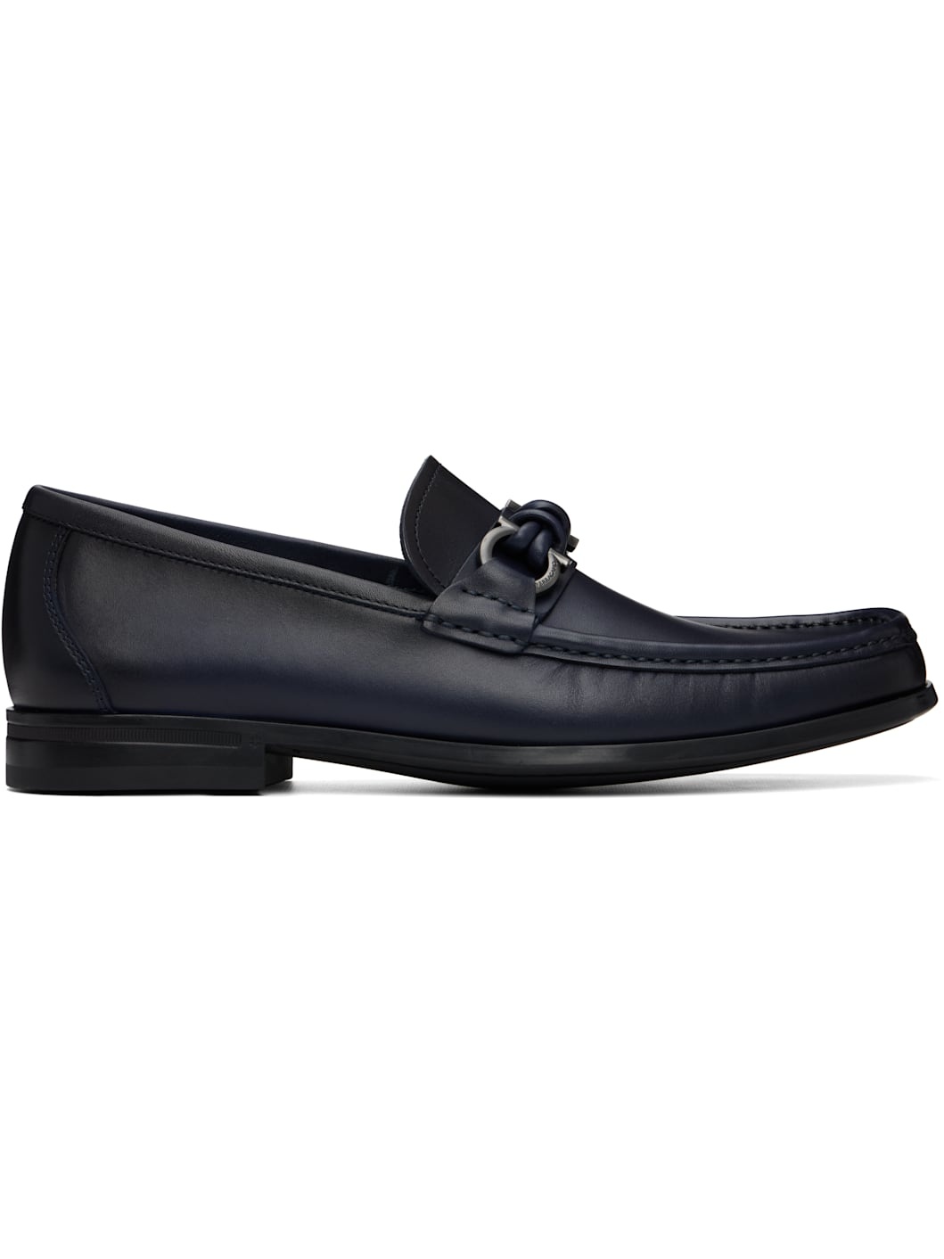 Buffed calfskin loafers. · Square moc toe · Logo hardware at vamp · Calfskin suede lining · Rubber sole Supplier color: Navy Upper: calfskin. Sole: rubber. Made in Italy 252270M225004
