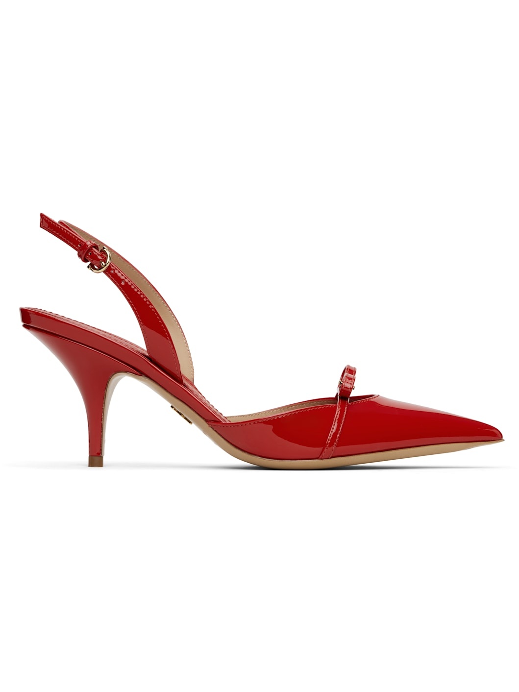Patent leather heels in red. · Pointed toe · Logo charm and bow accent at vamp · Pin-buckle slingback strap · Covered stiletto heel with rubber injection · Leather sole · Gold-tone hardware · Heel: H3" Supplier color: Flame red Upper: leather. Sole: leather, rubber. Made in Italy 251270F122001