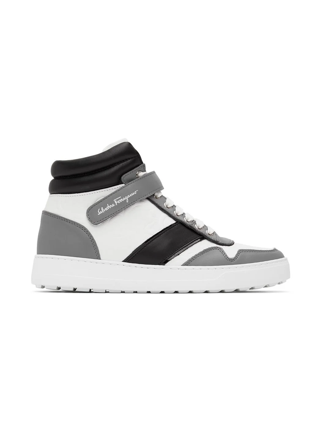 High-top paneled buffed calfskin sneakers in white, gray, and black. · Graphic embossed throughout · Lace-up and logo-printed velcro closure at vamp · Padded collar and tongue · Grained leather lining · Rubber midsole · Treaded rubber outsole Supplier color: Hermatite/White Upper: leather. Sole: rubber.