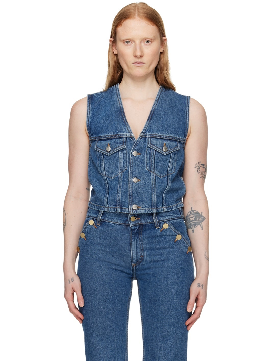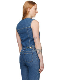 Non-stretch TENCEL™ lyocell-blend denim vest. Fading and subtle distressing throughout. · Y-neck · Button closure · Flap pockets · Cropped hem · Logo-engraved silver-tone hardware · Contrast stitching in tan Supplier color: Washed mid blue 78% cotton, 22% lyocell. Made in Italy 241072F068000