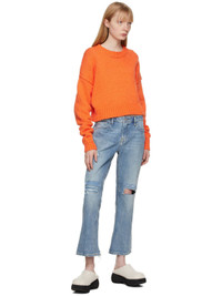 Flared non-stretch denim jeans in blue. Fading, whiskering, and distressing throughout. · Mid-rise · Five-pocket styling · Belt loops · Zip-fly · Logo-engraved silver-tone hardware · Contrast stitching in tan Supplier color: Spears