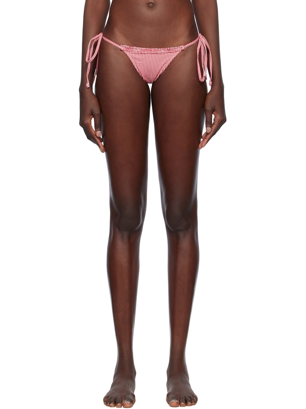 Stretch nylon jersey bikini bottom. Gingham pattern printed throughout. · Low-rise · Ruffled trim at waistband · Self-tie straps at sides · Fully lined Supplier color: Ladybug gingham 80% nylon, 20% spandex. Made in Colombia 251090F105034