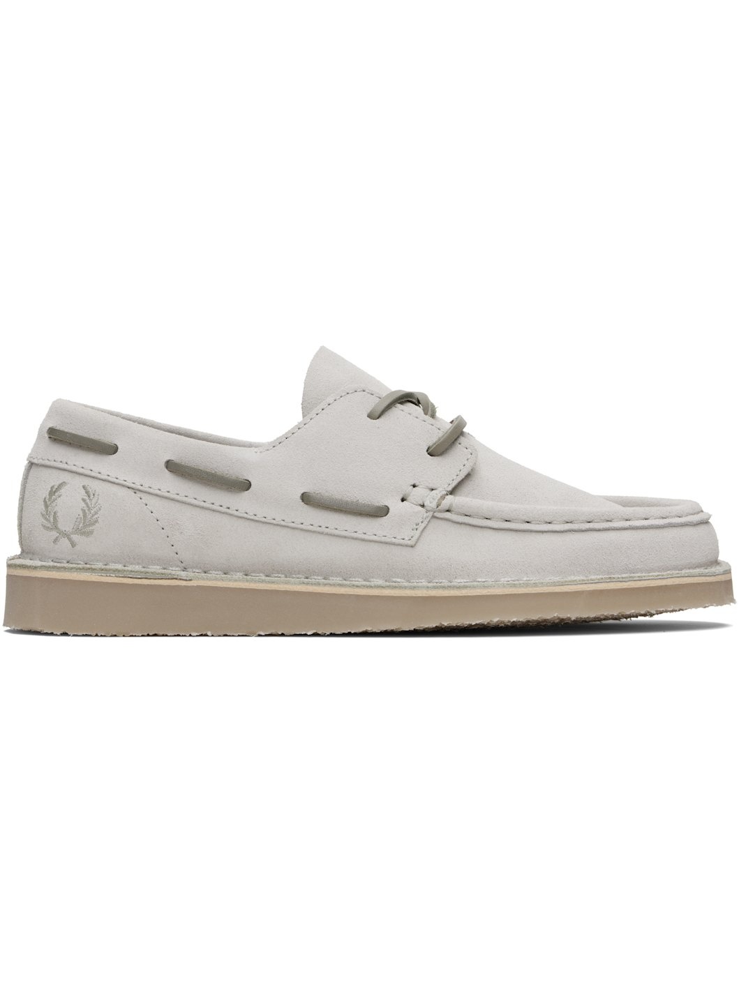Suede boat shoes. · Moc toe · Lace-up closure · Logo embroidered at outer side · Topstitching at welt · Crepe-rubber sole Supplier color: Light oyster Upper: leather. Sole: rubber. Made in Portugal 252719M239000