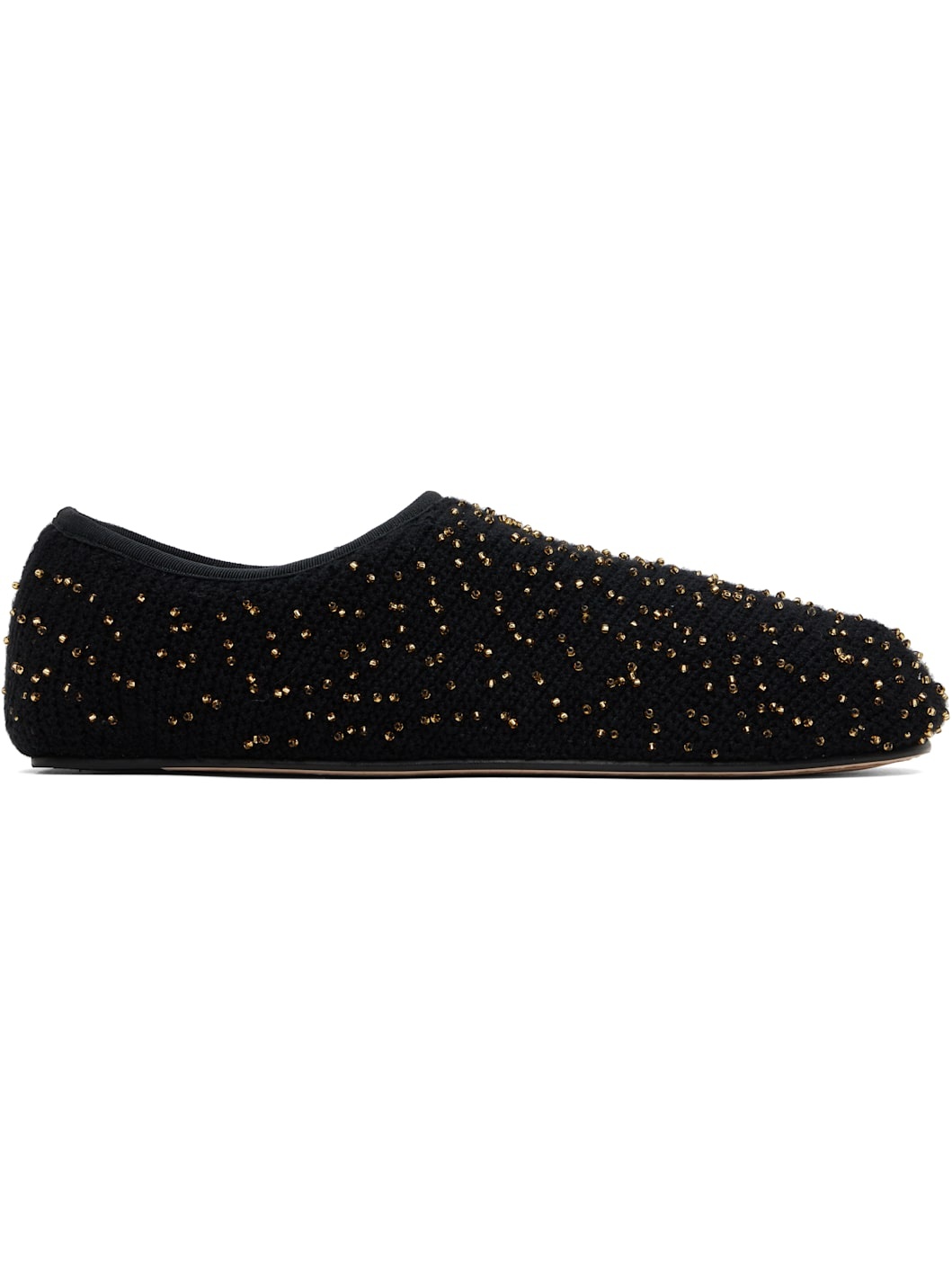 Knit cashmere ballerina flats in black. · Beaded detailing throughout · Square toe · Faille trim at collar · Buffed leather lining · Calfskin sole with rubber injection Supplier color: Black/Gold Upper: textile. Sole: calfskin, rubber. Made in Italy 251854F118002