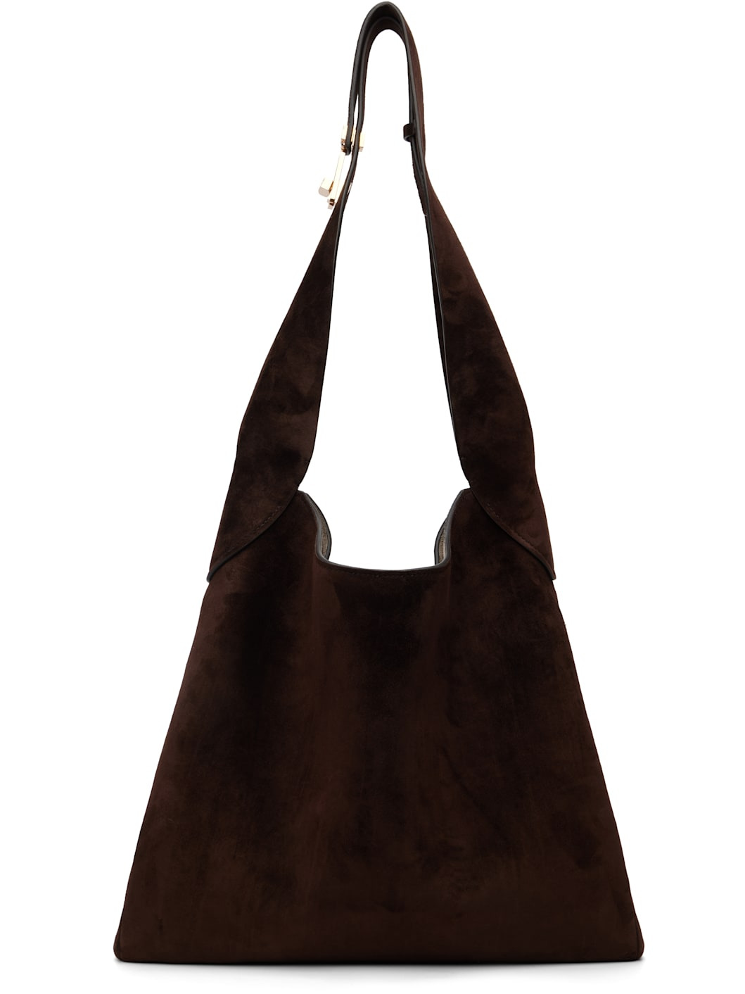 Calfskin suede tote. · Turn-lock fastening at shoulder strap · Magnetic closure · H13" x W14" x D2" Supplier color: Dark brown Calfskin. Made in Italy 252854F049002