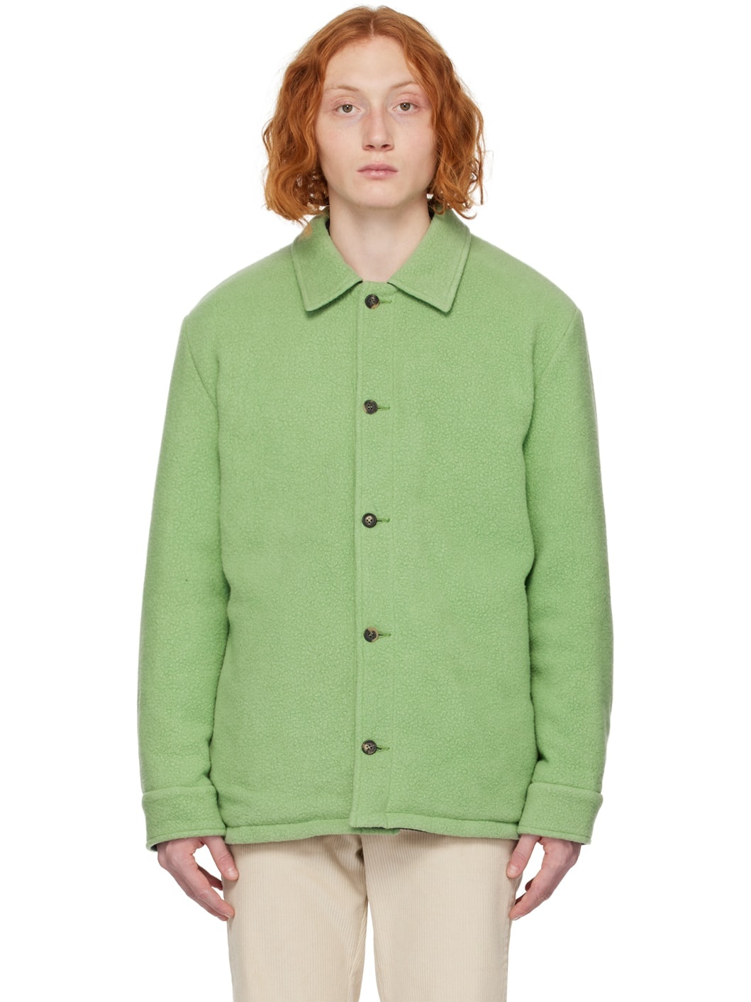Insulated recycled cashmere boucle jacket. Reverse in navy recycled nylon satin. · Spread collar · Button closure · Flap pockets and seam pockets · Single-button barrel cuffs Supplier color: Aventurine green Body 1: 100% recycled cashmere. Body 2: 100% recycled polyamide. Fill: 50% recycled cashmere, 50% recycled polyester. Made in Italy 231854M180004