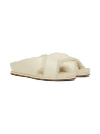 Patent calfskin slip-on sandals in off-white. · Open round toe · Criss-crossing straps at vamp · Faux-fur lining · Calfskin sole with rubber injection Supplier color: Cream Calfskin. Made in Italy 231854F124000