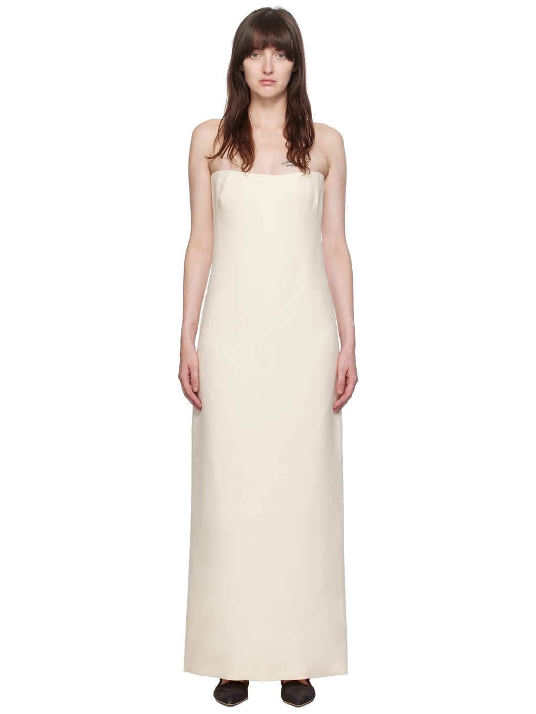 Wool- and silk-blend crepe dress. Boning throughout. · Strapless construction · Straight neck · Darts at chest · Zip closure at back · Central vent at back hem · Full silk crepe and stretch nylon mesh lining Supplier color: Ivory Body: 77% wool, 23% silk. Lining 1: 100% silk. Lining 2: 86% polyamide, 14% elastane. Made in Italy 242854F055002