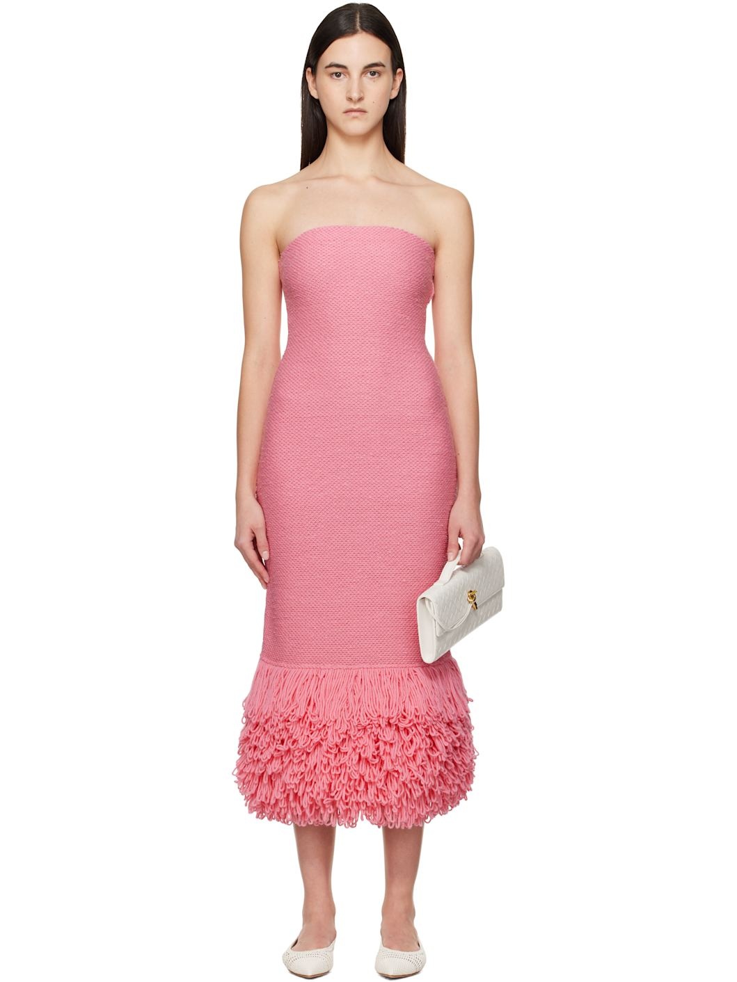 Breathable knit virgin wool- and silk-blend midi dress. · Straight neck · Fringe at hem · Concealed zip closure at side seam Supplier color: Rosa 47% virgin wool, 33% silk, 20% cashmere. Made in Italy 251854F054000