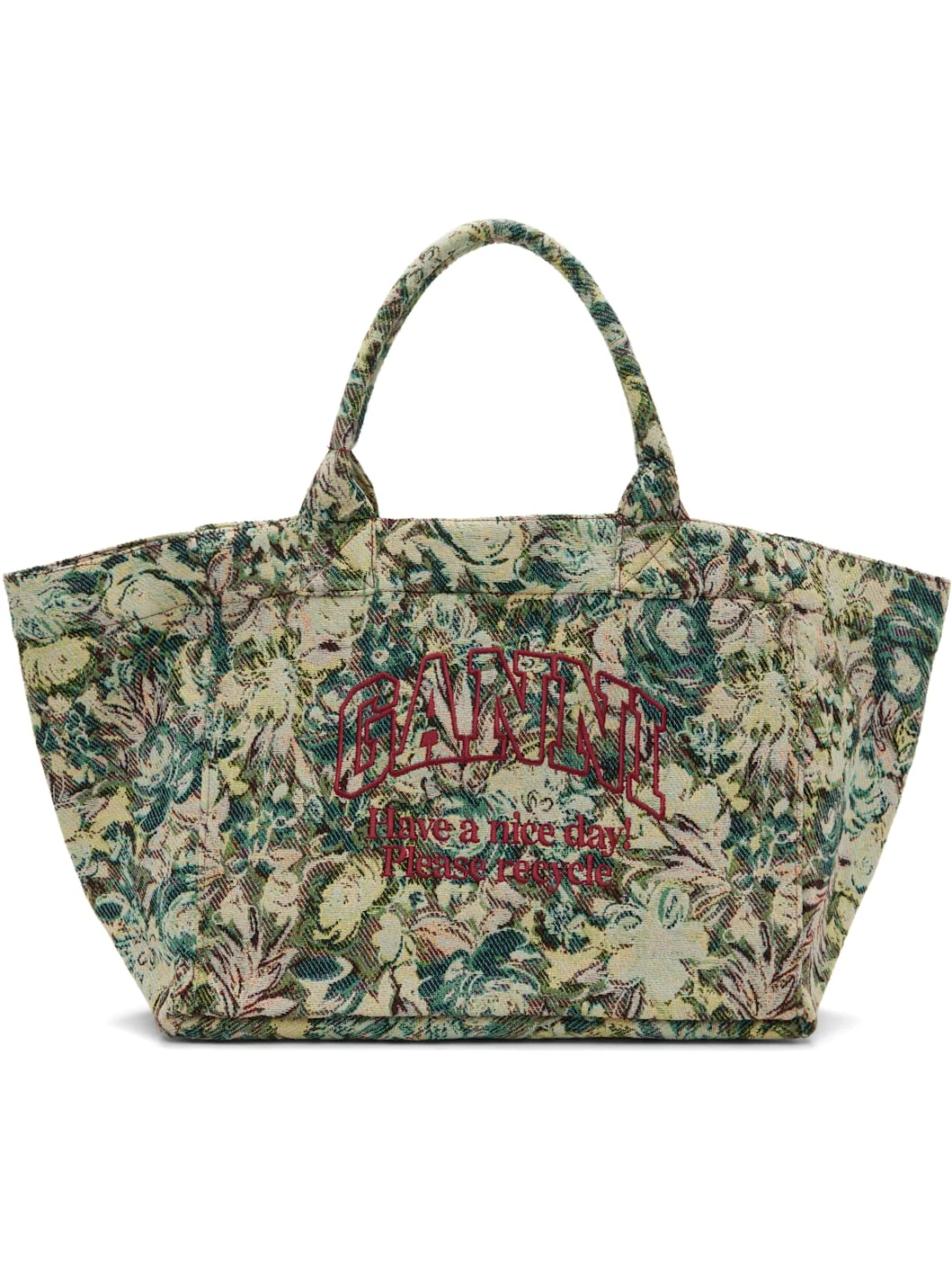 Brocade tote. · Jacquard floral pattern throughout · Rolled shoulder straps · Logo and text embroidered at face · Zip pocket at interior · Contrast stitching in red · H13.5" x W25" x D7" Supplier color: Jadeite Textile. Made in India 252144F049014