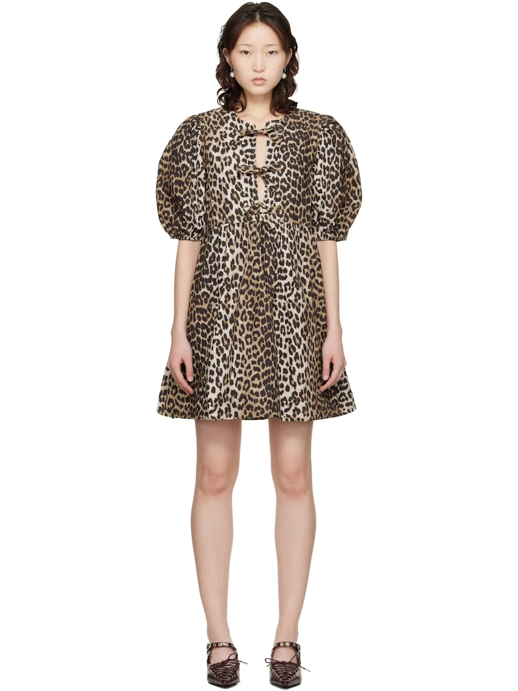 Organic cotton poplin minidress. · Leopard pattern printed throughout · Round neck · Self-tie fastenings at front · Gathering at waist · Puff sleeves Supplier color: Leopard 100% organic cotton. Made in India 261144F052008
