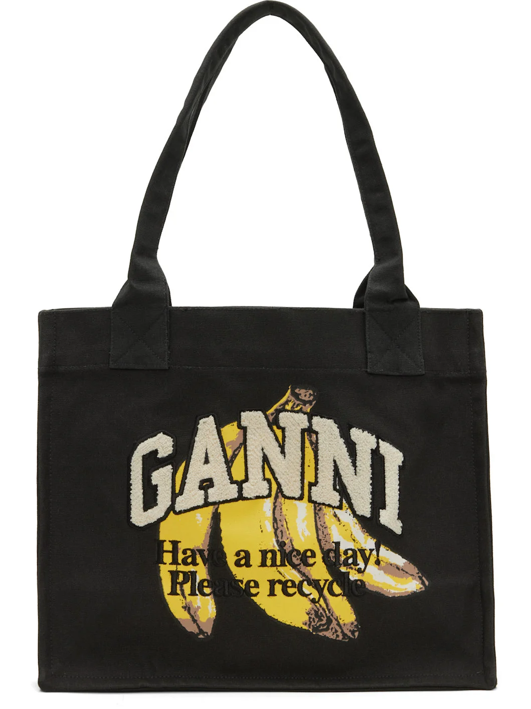 Recycled cotton canvas tote. · Rolled shoulder straps · Boucle logo applique and embroidered text at face · Graphic printed at face · Zip pocket at interior · H11.5" x W14.5" x D6.5" Supplier color: Black Textile. Made in India 252144F049002