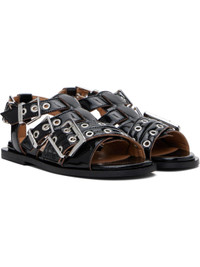 Patent faux-leather flat sandals in black. · Open toe · Pin-buckle crisscrossing straps at vamp · Partially elasticized pin-buckle slingback strap · Logo embossed at padded footbed · Buffed faux-leather lining · Stacked rubber block heel · Faux-leather sole · Logo-engraved silver-tone hardware Supplier color: Black Upper: synthetic. Sole: synthetic, rubber. Made in Portugal 251144F124001