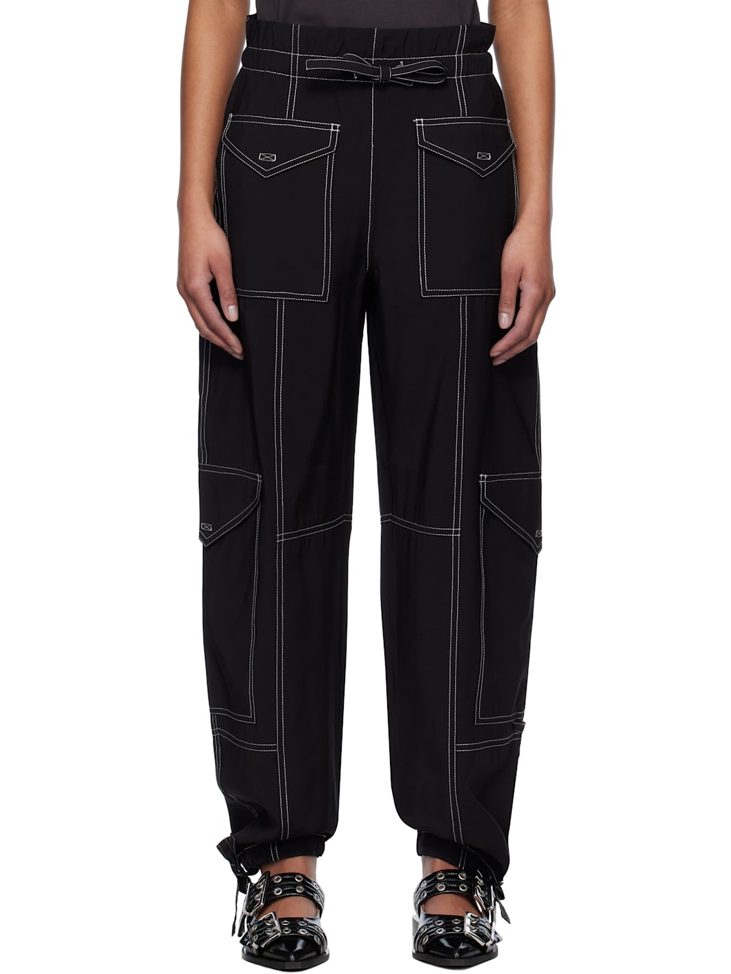 Relaxed-fit plain-woven slub LENZING™ ECOVERO™ viscose-blend trousers. · Paneled construction · Drawstring at elasticized waistband · Six-pocket styling · Drawstring at cuffs · Flap pocket at outseams · Contrast stitching in white Supplier color: Black 86% viscose, 14% polyester. Made in Turkey 251144F087005