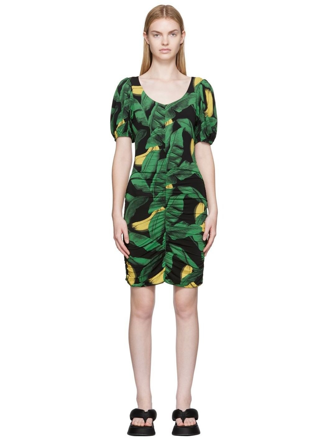Stretch viscose jersey dress. Graphic pattern printed throughout. · Scoop neck · Ruching at front, back, and side-seams · Elasticized cuffs · Fully lined Supplier color: Black 95% viscose, 5% elastane. Made in Portugal 222144F052019