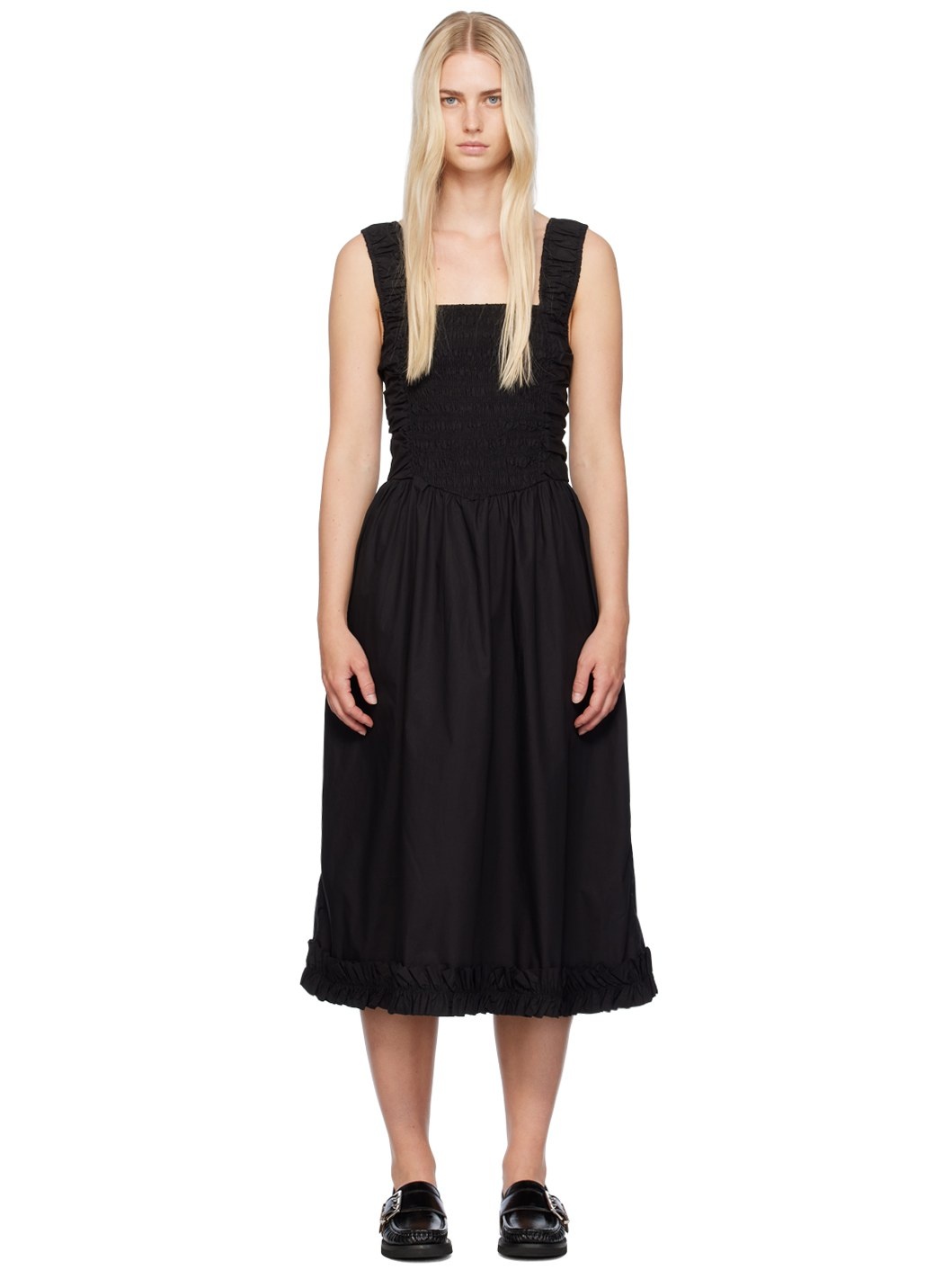 BLACK COTTON POPLIN MIDI STRAP SMOCK DRESS