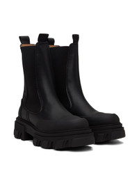 Calf-high buffed recycled leather Chelsea boots in black. · Rubber cap toe · Pull-loops at collar · Elasticized gusset at sides · Logo bonded at heel tab · Buffed leather lining · Logo embossed at heel · Treaded rubber sole Supplier color: Black Upper: leather, textile. Sole: rubber. Made in Portugal 242144F114001