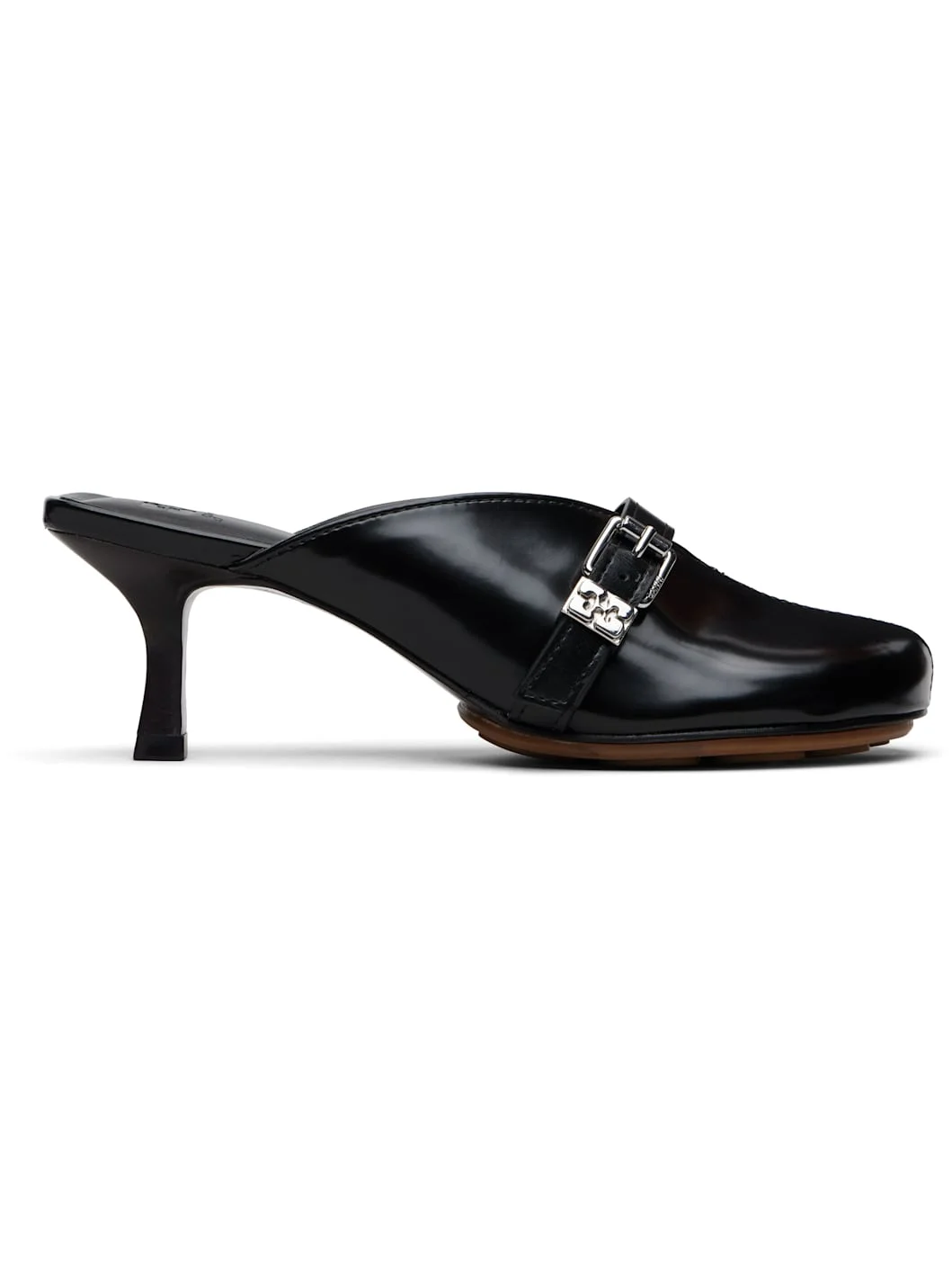 Polished Oleatex™ faux-leather slip-on heels. · Central seam at vamp · Pin-buckle strap at vamp · Logo hardware at outer side · Logo stamp at padded footbed · Covered kitten heel with rubber injection · Faux-leather sole with rubber injection · Heel: H2.5" Supplier color: Black Upper: synthetic. Sole: synthetic, rubber. Made in Brazil 252144F122003